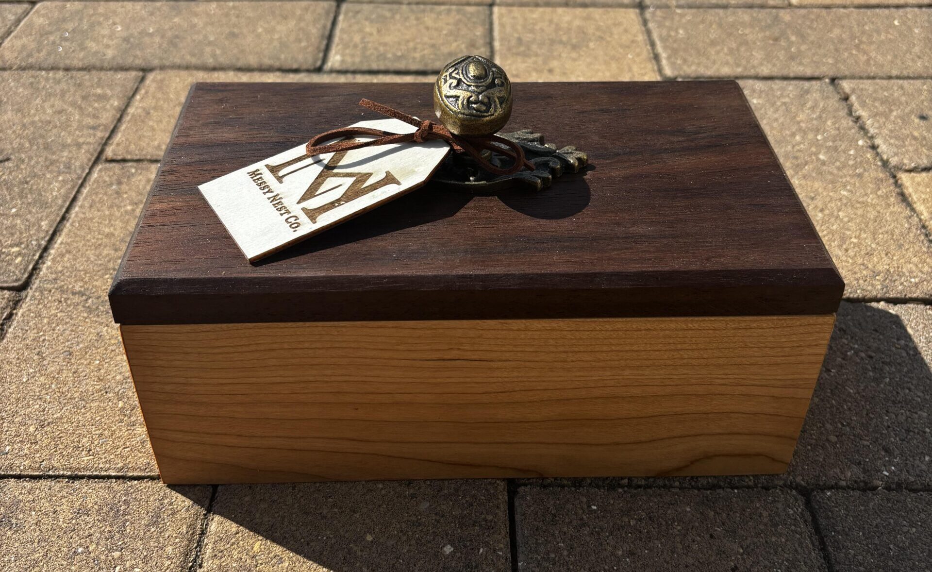 This handmade box is crafted from rich Peruvian Walnut and warm Cherry hardwood, creating a timeless contrast of deep and golden tones. The knob handle adds both charm and function, offering easy access while maintaining a clean, classic look.