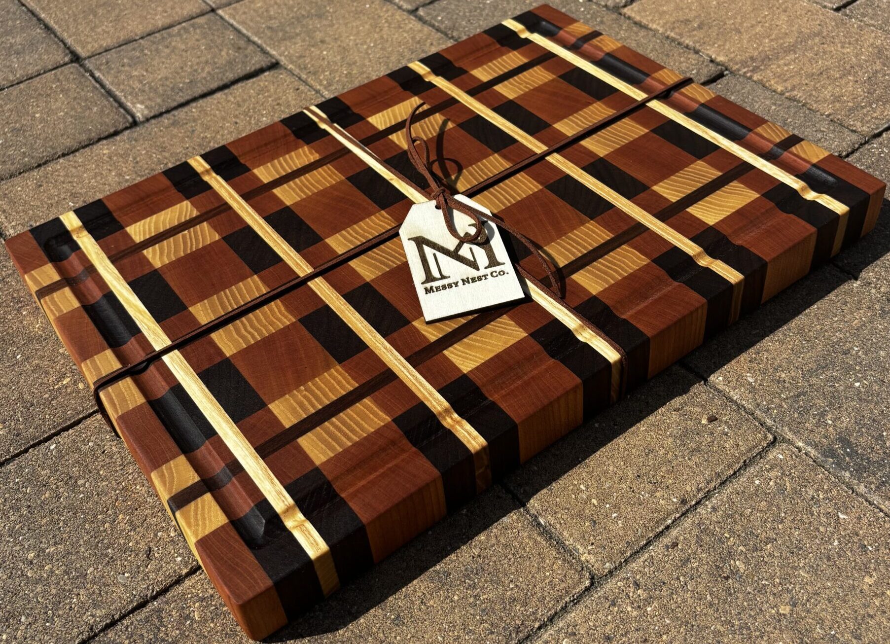 This end-grain cutting board features a striking plaid design handcrafted from Sapele, Ash, and Walnut. The rich blend of warm mahogany tones, creamy ash highlights, and deep walnut accents creates a timeless pattern that’s both bold and elegant.