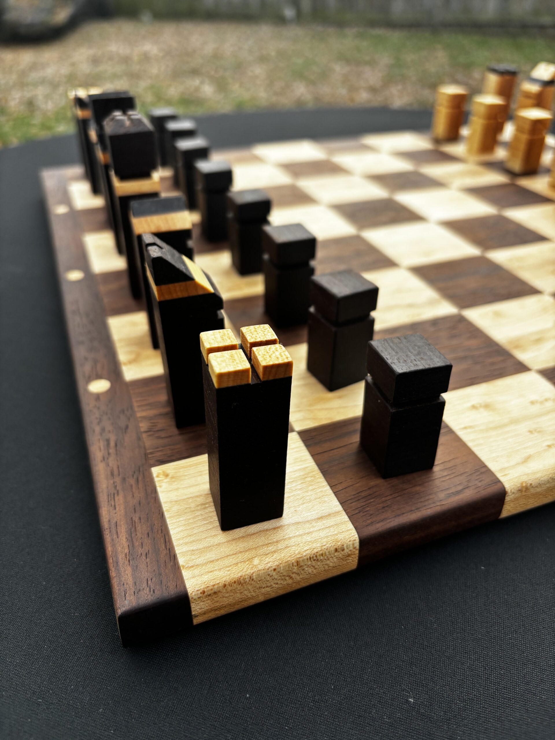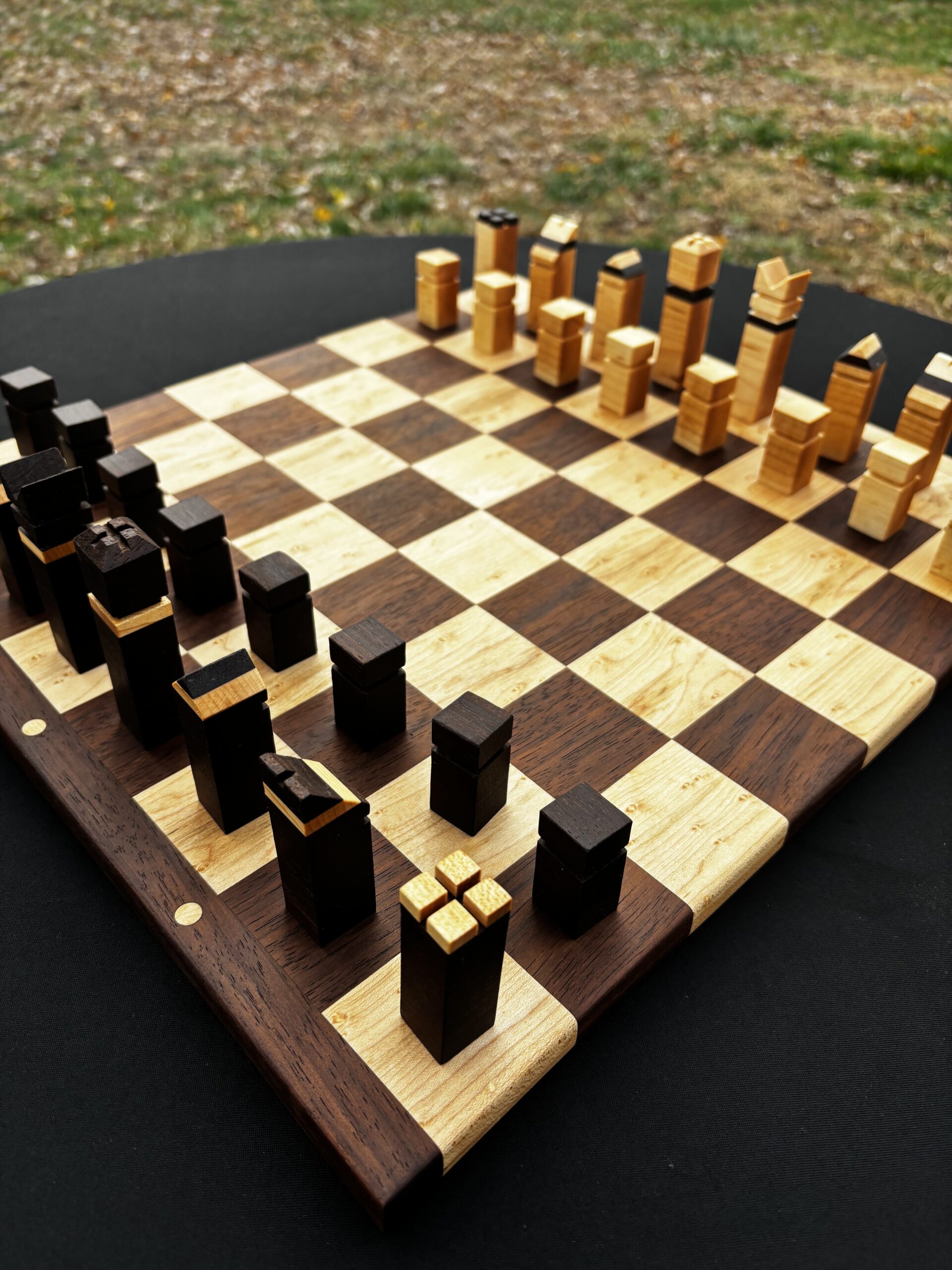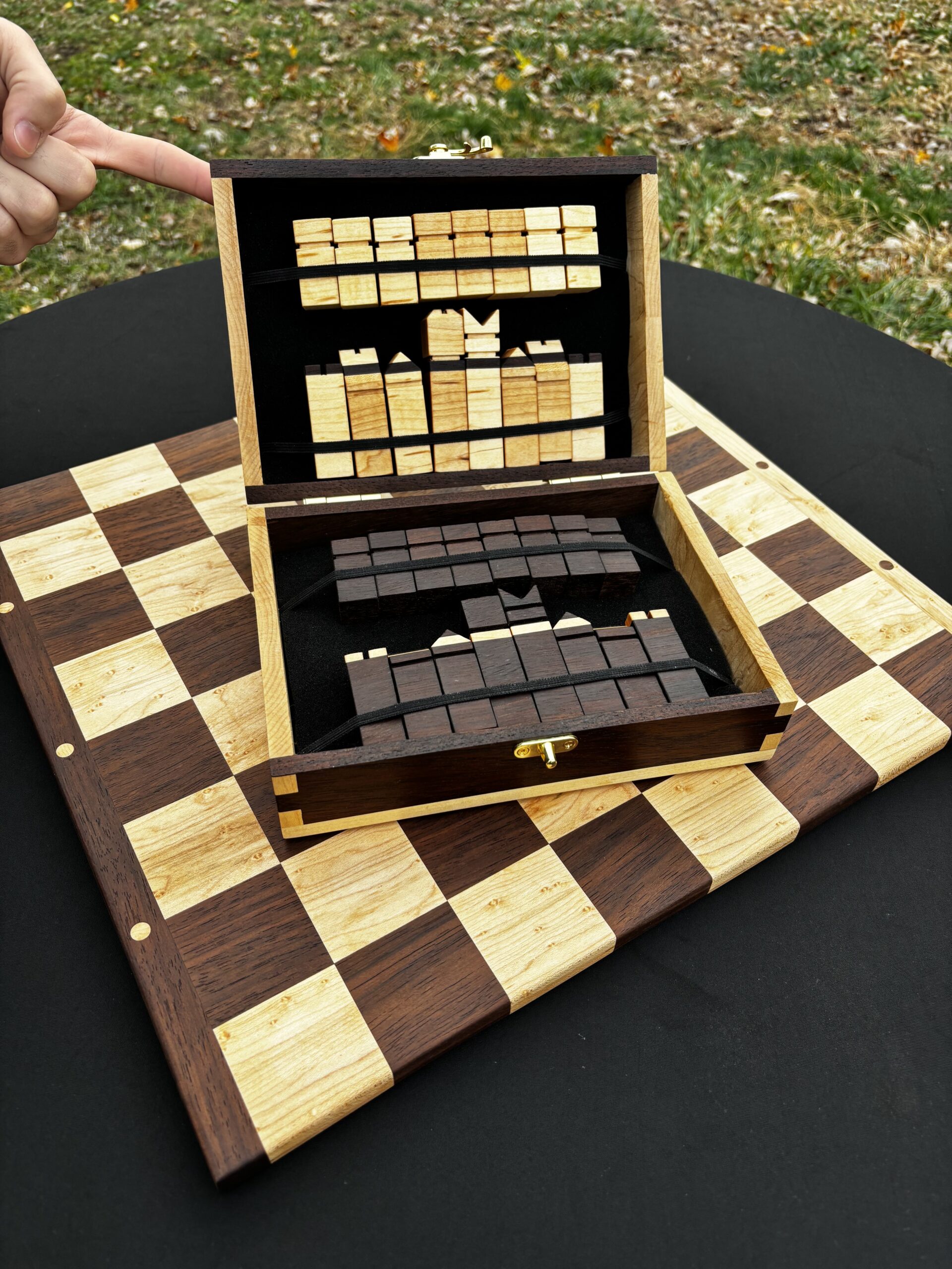 A timeless work of craftsmanship and design, this handcrafted chess set features a striking Peruvian Walnut and White Hard Maple board paired with a matching storage box and handmade wooden pieces. The deep, chocolate tones of Walnut contrast beautifully against the bright, elegant Maple, creating a board that’s both visually captivating and built for play.