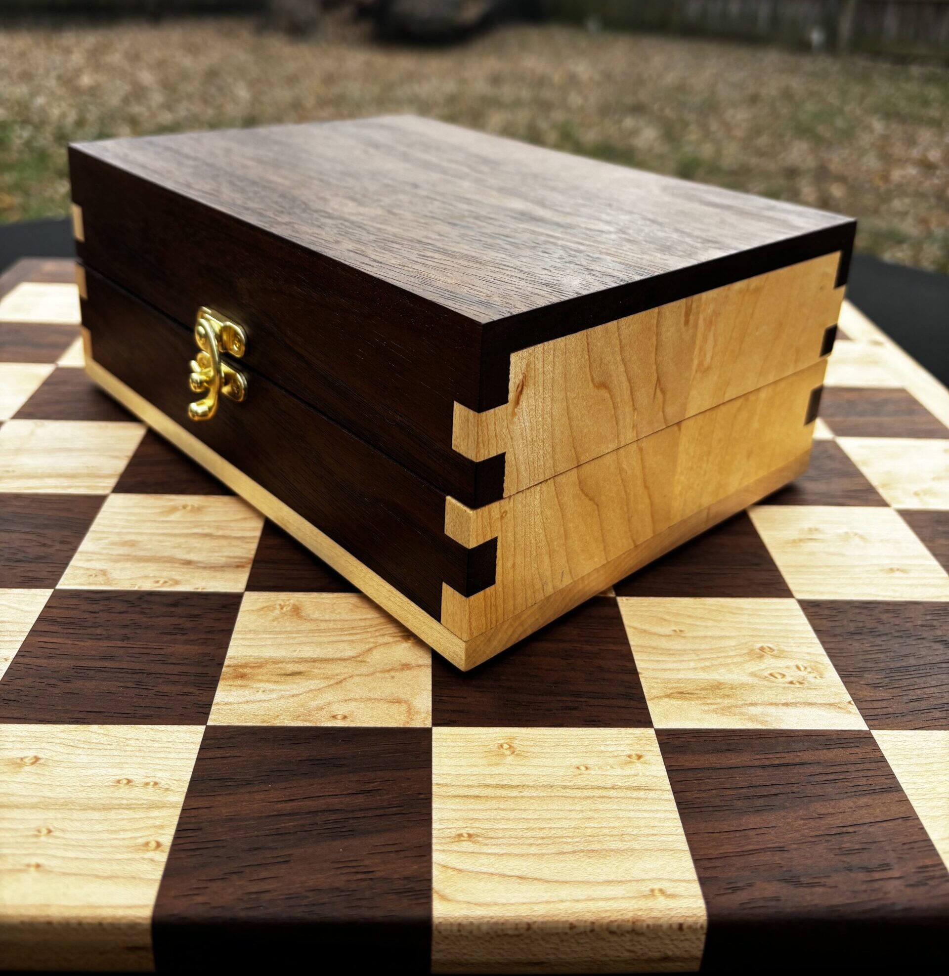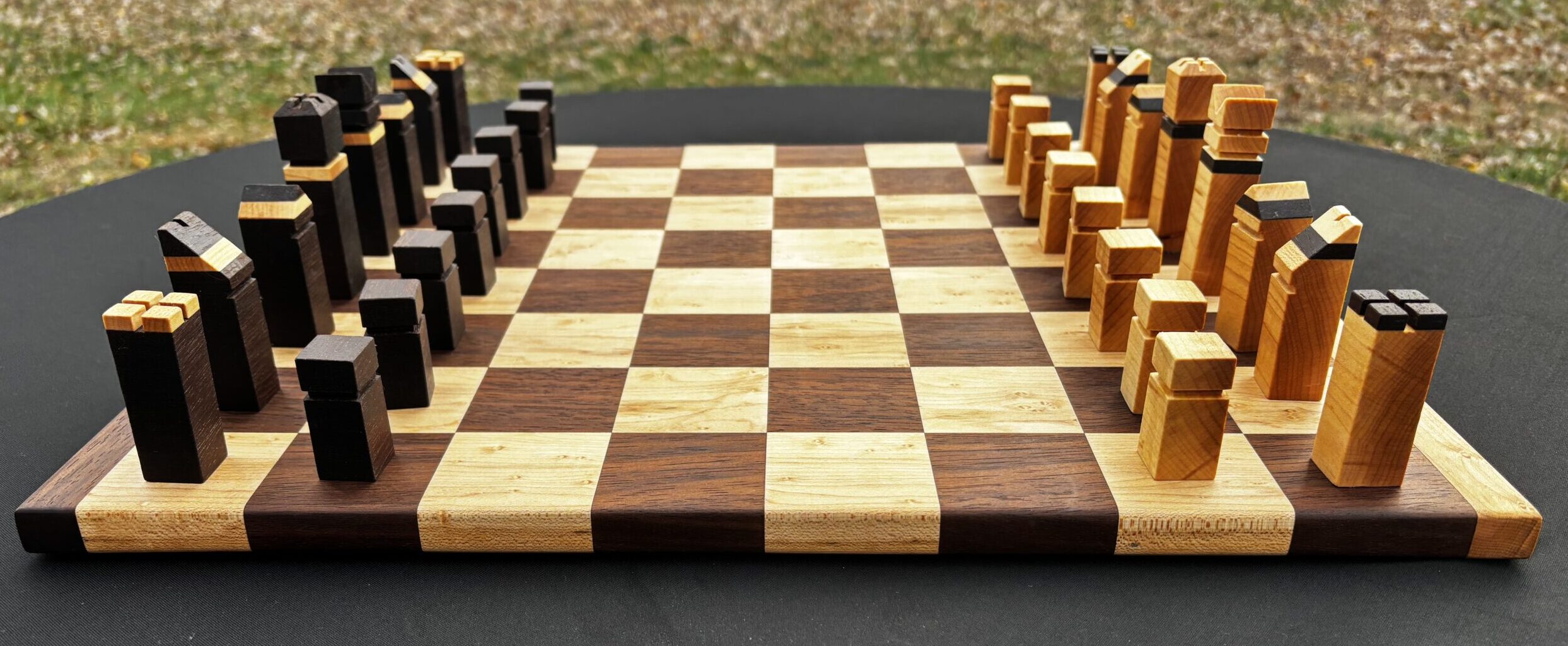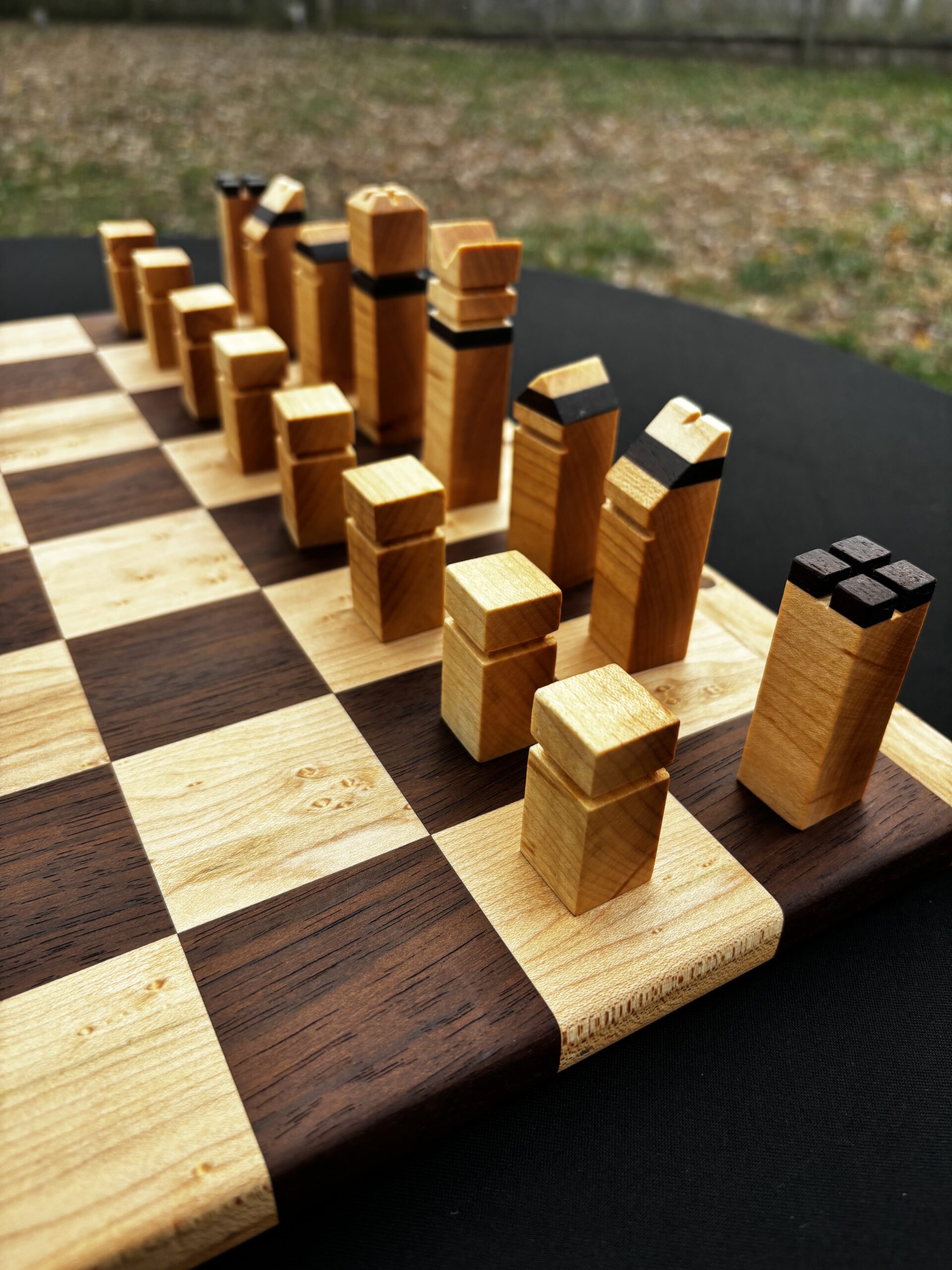 A timeless work of craftsmanship and design, this handcrafted chess set features a striking Peruvian Walnut and White Hard Maple board paired with a matching storage box and handmade wooden pieces. The deep, chocolate tones of Walnut contrast beautifully against the bright, elegant Maple, creating a board that’s both visually captivating and built for play.